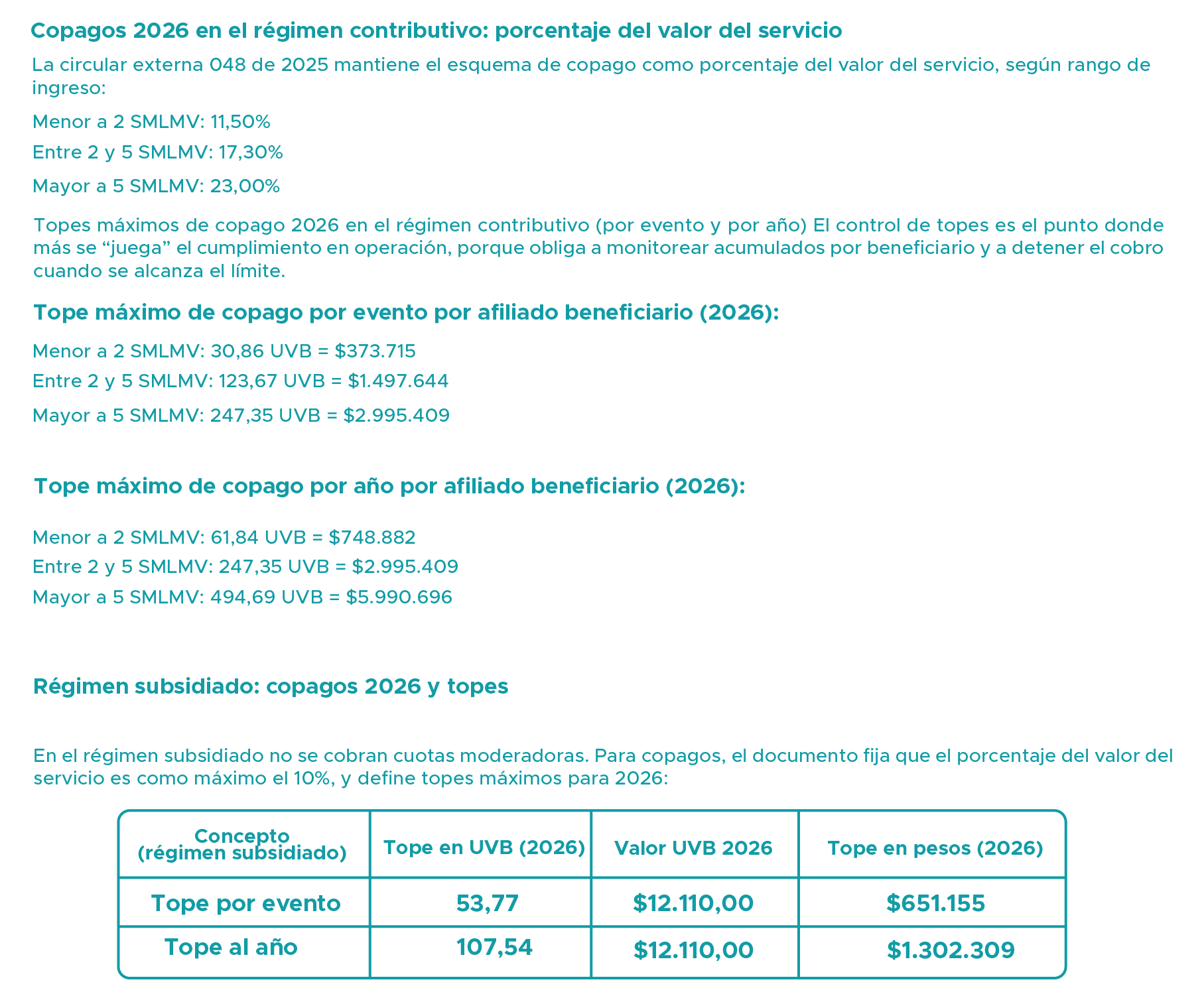 Los valores de los copagos año 2026, que deben ser pagados en efectivo previo a la atención en la IPS, son las siguientes: